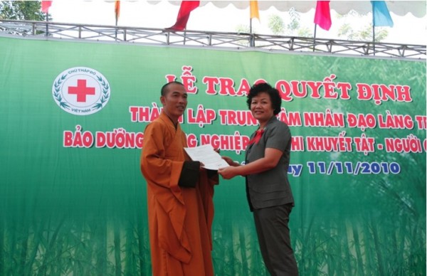 Cô Hồng Hóa – Phó Chủ Tịch TW Hội Chữ Thập Đỏ, trao quyết định thành lập Trung tâm Nhân đạo Làng Tre cho Đại đức Thích Chiếu Bổn.