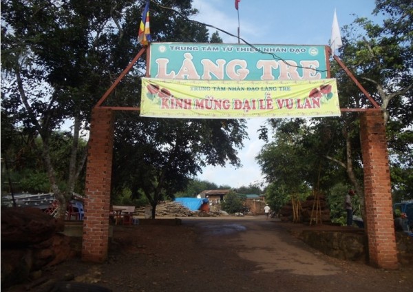Khi vào đến Làng Tre, đầu tiên ta sẽ thấy được cổng chào. Nó đơn giản chỉ với hai cột trụ vuông bằng gạch cùng với đó là một tấm bảng mang dòng chữ “Trung tâm Từ thiện Nhân đạo Làng Tre” đã cũ và rỉ sét.